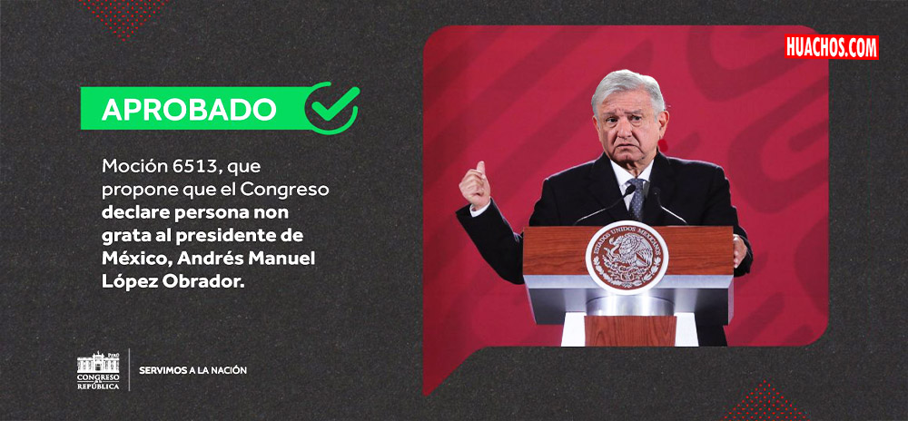 El Pleno del Congreso aprobó la moción de orden del día que declara persona no grata al presidente de los Estados Unidos Mexicanos, Andrés Manuel López Obrador (AMLO); y exhortar a los ministerios del Interior y de Relaciones Exteriores para que, cada uno dentro de sus competencias, realicen las acciones necesarias para garantizar que no ingrese al territorio nacional.