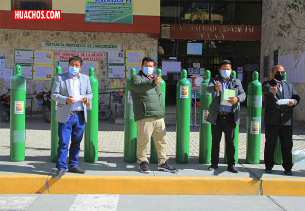 PAMPAS (Tayacaja) | Luego de entregar al Hospital de Pampas los ambientes y asumir con los gastos para el funcionamiento del Centro de Atención Hospitalaria Temporal (CAHT), la Municipalidad Provincial de Tayacaja entregó 10 balones de oxígeno de 10 m3 con contenido más su respectivo manómetro de presión y accesorios para ser utilizados en los pacientes que se encuentran internados en el nosocomio.
