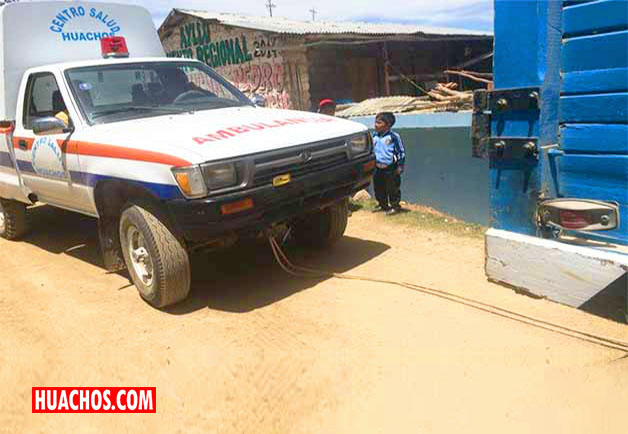 La ambulancia de la Micro Red de Salud de Huachos se quedó varado en medio camino, un camión tuvo que jalarlo hasta su estacionamiento.