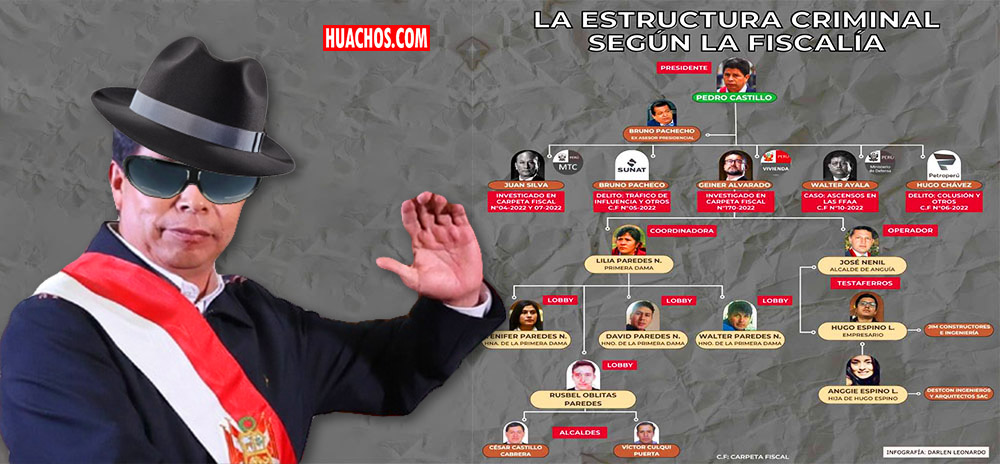 El Equipo Especial contra la Corrupción del Poder elaboró y presentó un organigrama de la presunta organización criminal que estaría liderada por el presidente de la República, Pedro Castillo Terrones, la misma que se dedicaría a direccionar licitaciones públicas a “dedo” en los gobiernos locales (municipales) a fin de beneficiar a su entorno familiar con el dinero del Estado, según la investigación que formalizó el representante de la Fiscalía, Hans Aguirre.