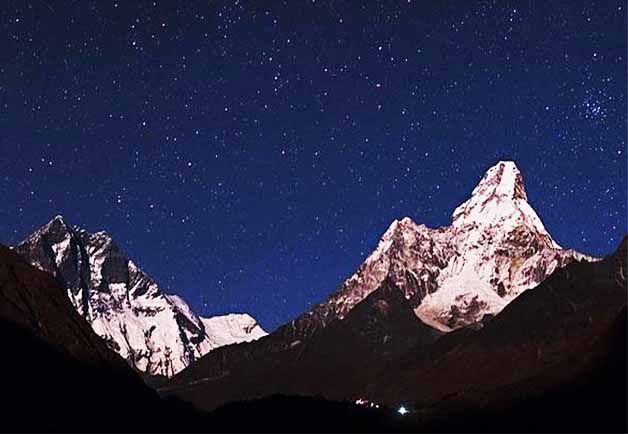 A la izquierda, a ras de suelo, un chorten o estupa, construcción budista que se usa como contenedor de reliquias o para proteger (espiritualmente hablando) pasos montañosos. Ambos, bóveda y skyline pétreo, fueron y serán mientras la estupa es solo presente, un renglón exiguo de la historia del mundo, igual que esas lucecitas de frontales que llevan unos alpinistas que irrumpen en la noche bajo la mole del Ama Dablan.