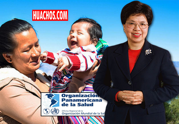 Dra. Margaret Chan, directora general de la OPS/OMS al lado de una madre peruana y su hijo.