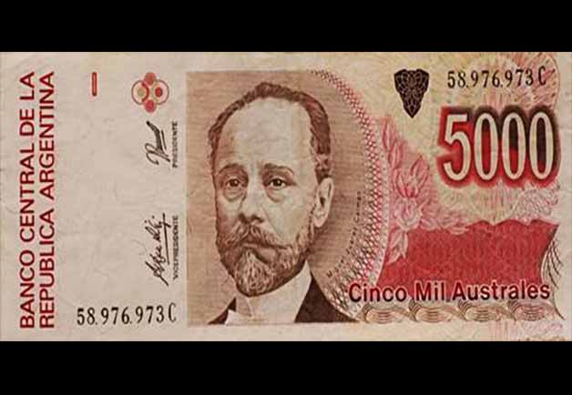 EBillete de 5 mil australes emitido en 1985 con la imagen del presidente argentino Miguel Ángel Juárez Celman (presidente 1886-1890) El fue destituído de su cargo en 1890.