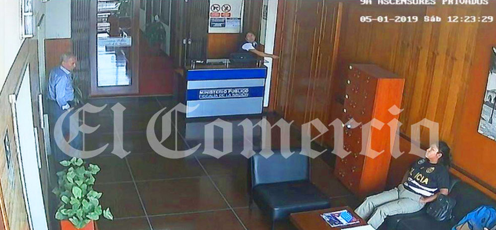 En la visualización de las imágenes de las cámaras de seguridad se aprecia que Pedro Chávarry ingresa a las 12:23 p.m. al noveno piso del Ministerio Público, donde está el despacho del fiscal de la Nación. Lo hace acompañado por el suboficial y miembro de su seguridad Juan Arias Contreras, quien minutos después participó en la violación de la oficina lacrada.