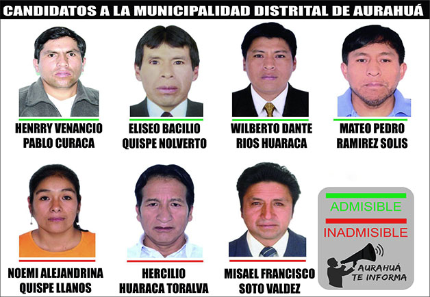 Conozca a los 7 personas( arriba en la foto) que se inscribieron para ser el próximo alcalde de la municipalidad distrital de Aurahuá, provincia de Castrovirreyna, departamento de Huancavelica. Los que están con linea verde son admisibles y los de la linea roja, inadmisibles, pero han apelado.