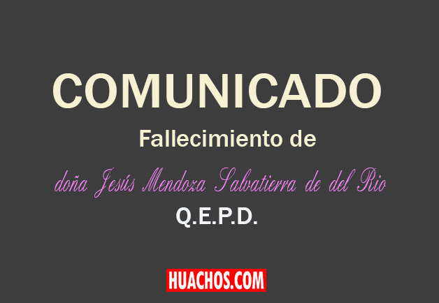Huachos.com tiene el pesar de anunciar le deceso de quien en vida fue la distinguida dama armeña doña Jesús Mendoza Salvatierra viuda de don Justino del Rio (Q.E.P.D.) acaecido el día de hoy en la ciudad de Lima.