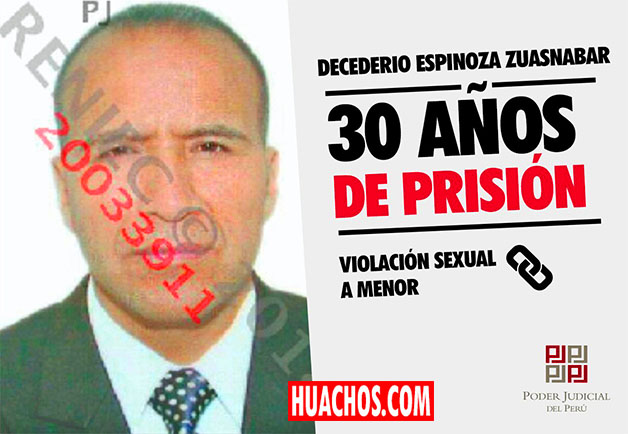 HUANCAVELICA - El colegiado de la Primera Sala Penal de Apelaciones de la Corte Superior de Justicia de Huancavelica, integrado por los magistrados Dr. Carlos Richard Carhuancho Mucha, Dr. Omar Leví Paucar Cueva, Dr. José Julián Huayllani Molina; confirmaron la sentencia condenatoria a 30 años de pena privativa de la libertad con carácter de efectiva, recaída en la resolución número 14 de fecha 22 de Enero del 2018 emanada por el colegiado virtual de Huancavelica, mediante el cual falla condenando al acusado Decederio Espinoza Zuasnabar (54) como autor del delito contra la Libertad Sexual en la modalidad de Violación Sexual a menor de edad, previsto y sancionado en el primer párrafo inciso 2) del artículo 173° del Código Penal en agravio de la menor de iniciales C.A.S.C.