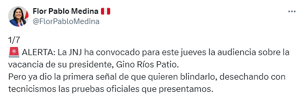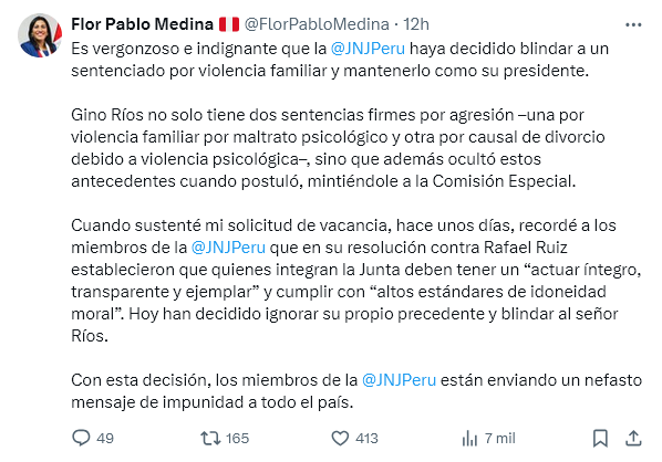 "Es vergonzoso e indignante que la JNJ haya decidido blindar a un sentenciado por violencia familiar y mantenerlo como su presidente", escribió Flor Pablo, quien fue autora de una de las tres solicitudes que pedían la vacancia de Ríos Patio.