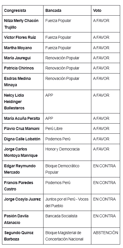 Los parlamentarios que se opusieron fueron Edgar Reymundo Mercado de Bloque Democrático Popular , Francis Paredes Castro de Podemos Perú, Jorge Coayla Juarez de Juntos por el Perú - Voces del Pueblo, Pasión Dávila Atanacio de la Bancada Socialista. Y votó en abstención Segundo Quiroz Barboza de Bloque Magisterial de Concertación Nacional.