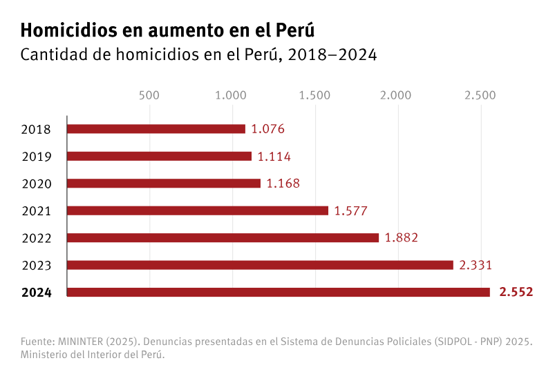 En 2024, el Perú registró la cifra más alta de homicidios en al menos siete años, y la mitad de estos asesinatos han sido atribuidos a sicarios. Las denuncias por extorsión alcanzaron su punto máximo en 2023 y se mantuvieron en niveles elevados en 2024.