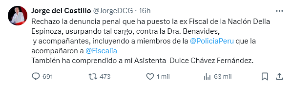 A través de su cuenta oficial de X, el abogado de Patricia Benavides, Jorge de Castillo, se pronunció en contra de la denuncia interpuesta por Delia Espinoza contra su patrocinada y rechazó lo señalado por Espinoza. Además, Del Castillo también señaló que la demanda alcanzó a su asistencia Dulce Chávez Fernández.