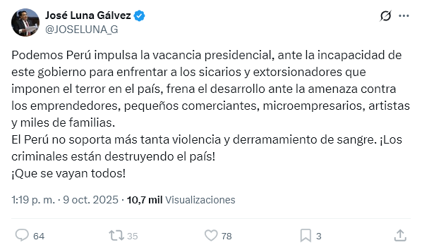 — Bancada Renovación Popular (Oficial) (@bancada_rp) October 9, 2025