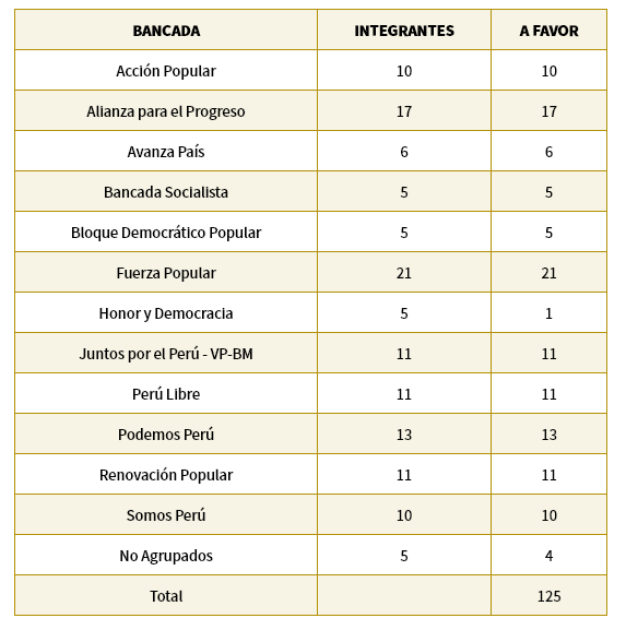 El reglamento del Legislativo, una moción de vacancia debe ser presentada con las firmas de 26 legisladores, en tanto se requieren 52 para que esta llegue a ser admitida a trámite y 87 para que sea aprobada. Al cierre de este informe, ya había sido oficializada una de ellas, y múltiples anuncios confirmaban esta tendencia.