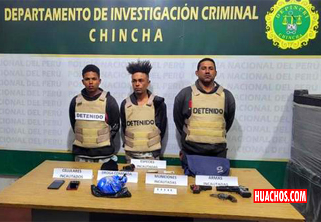 CHINCHA ALTA | Tres ciudadanos de nacionalidad venezolana fueron detenidos por la Policía la tarde del sábado en la calle José Faustino Sánchez Carrión en Chincha Alta. Estos sujetos están sindicados de pretender asaltar el grifo que está ubicado en la quinta cuadra de esa zona, siendo sorprendidos por la policía y en el registro personal encontrados en posesión de armas de fuego, envoltorios con pasta básica de cocaína entre otras especies.