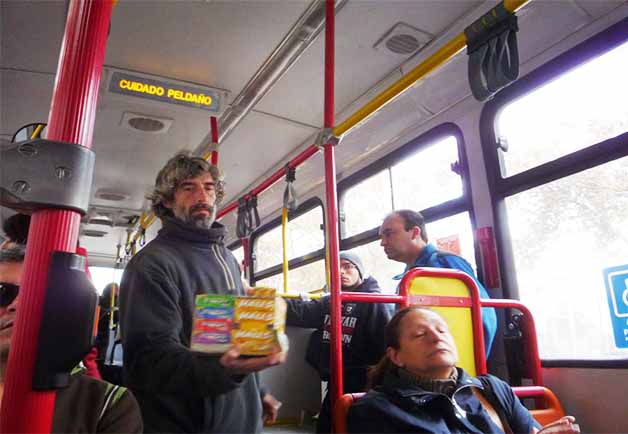 - Con el permiso del Sr. Chofer y del Sr. Cobrador, señores pasajeros disculpen que interrumpa su lindo viaje o tal vez su amena conversación, señores pasajeros vengo a vender estos riquísimo caramelos a 10 céntimos la unidad, mi esposa ha sufrido el día de ayer un grave accidente, yo estoy sin trabajo y las medicinas estas muy caras por lo que apelo a su compresión y a su solidaridad para poder cubrir el costo de estas medicinas, señores por favor….ayúdenme.