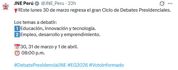 Carlos Jaico (Perú Moderno), George Forsyth (Somos Perú), Álvaro Paz de la Barra (Fe en el Perú), Fiorella Molinelli (Fuerza y Libertad), Alex González (Demócrata Verde), Carlos Espá (Sí Creo).