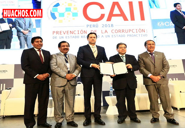 Suscribieron este “Compromiso por la Integridad” el presidente del Congreso, Daniel Salaverry; el contralor general, Nelson Shack; el secretario general de la Presidencia del Consejo de Ministros, Ramón Huapaya; Óscar Benavides, presidente de la Asociación de Municipalidades del Perú, e Iván Flores, presidente de la Red de Municipalidades Urbanas y Rurales del Perú, durante la clausura de la Conferencia Anual Internacional por la Integridad – CAII 2018.