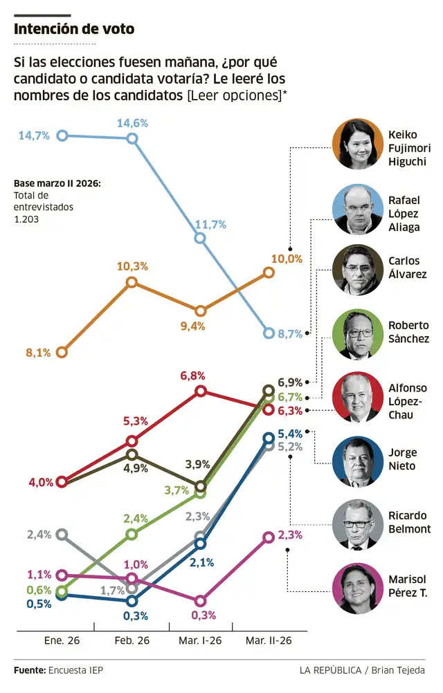 A una semana de las elecciones del 12 de abril, la lideresa de Fuerza Popular ocupa el primer lugar con 10% de intención de voto. A inicios de marzo tenía 9.4%; en febrero, 10.3%; y enero, 8.1%.