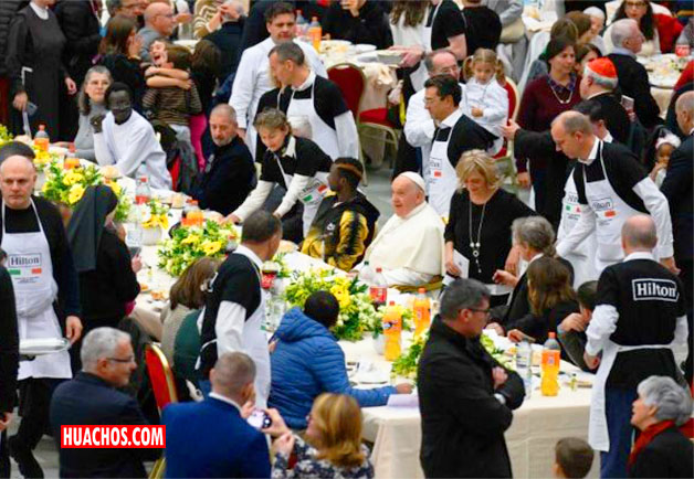 Los pobres y sus acompañantes, más de 1.200 personas en total, llenaron el Aula Pablo VI, transformada para la ocasión en un gran e insólito restaurante, para el habitual almuerzo con el Papa Francisco, con motivo de la Jornada Mundial de los Pobres que se celebra este 19 de noviembre. Antes de comenzar, el Papa dio la bendición, agradeciendo a Dios por el "momento de amistad, todos juntos", por la comida, por quienes la prepararon.