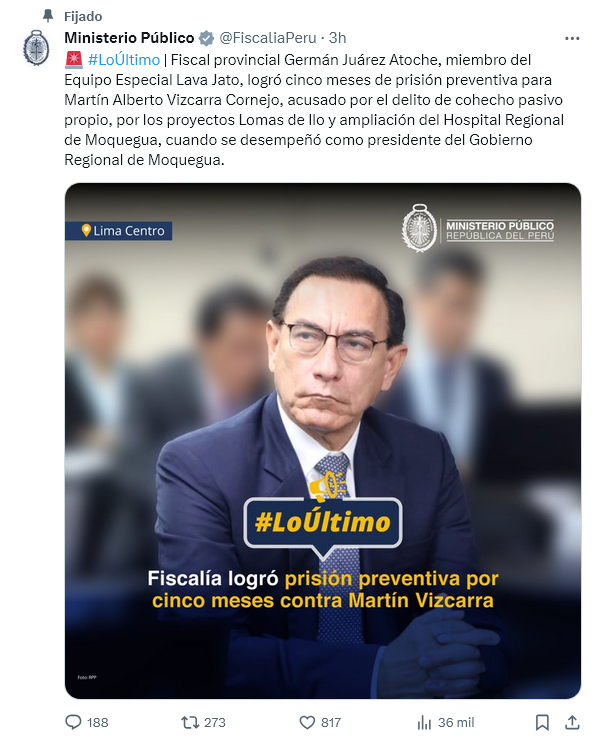En junio, el Poder Judicial rechazó el pedido inicial de prisión preventiva y dispuso comparecencia con restricciones, además le prohibió salir del país. Sin embargo, desde la Fiscalía se presentó un recurso de apelación para que se vuelva ha evaluar el pedido de prisión contra exmandatario, por lo que con esta decisión convierte a Vizcarra en el quinto expresidente peruano que purga prisión preventiva por actos de corrupción.
