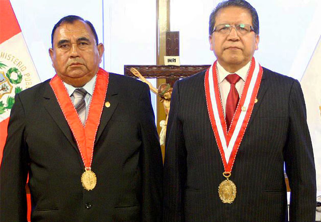 El Fiscal de la Nación, Pablo Sánchez Velarde (der), tomó juramento nuevo fiscal provincial titular de Chincha, Gavancho Hernández (izq).