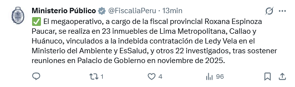 El Primer Despacho de la Primera Fiscalía Provincial Corporativa Especializada en Delitos de Corrupción de Funcionarios de Lima Centro, que dirige la fiscal provincial Roxana Inés Espinoza Paucar, ejecuta un megaoperativo de allanamiento en simultáneo contra una presunta red de corrupción vinculada a la emisión de órdenes de servicio y designaciones irregulares durante la gestión del expresidente de la república, José Jerí.