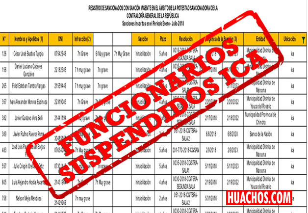 La Contraloría General informó que 1,728 funcionarios y servidores públicos fueron suspendidos o inhabilitados temporalmente para ejercer la función pública, al haber sido sancionados administrativamente por inconducta funcional (sanciones vigentes al 31 de diciembre del 2018).