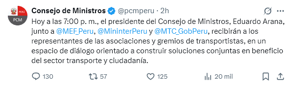 A través de un comunicado, el Gobierno de Dina Boluarte anunció una reunión con los representantes de los gremios de transporte tras confirmar la extensión del paro hasta de 48 horas en respuesta a la demora de las autoridades que no atienden el problema del incremento de asesinatos de choferes debido a las extorsiones.