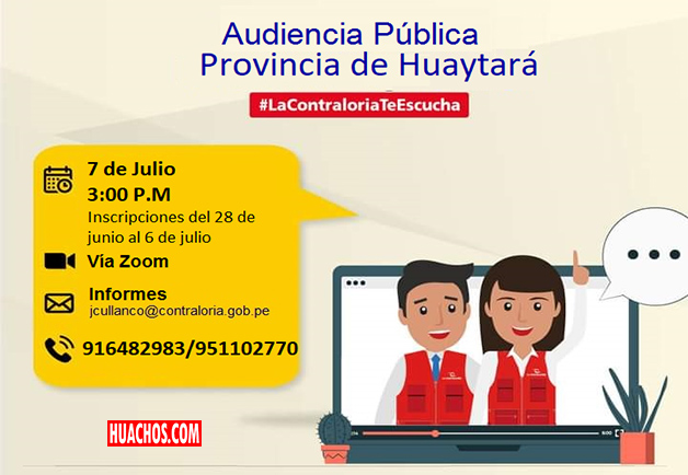 HUAYTARÁ | La Contraloría General convoca a los ciudadanos y representantes de la sociedad civil de la provincia de Huaytará a participar en la Audiencia Pública Virtual “La Contraloría te escucha”, que se realizará el jueves 7 de julio, con el objetivo de recibir sus alertas respecto a deficiencias en servicios públicos como de presunto uso inadecuado de bienes y recursos del Estado.
