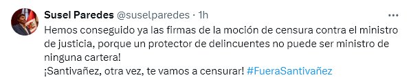 “Hemos conseguido ya las firmas de la moción de censura contra el ministro de justicia, porque un protector de delincuentes no puede ser ministro de ninguna cartera!”, señaló la parlamentaria en su cuenta en “X”.