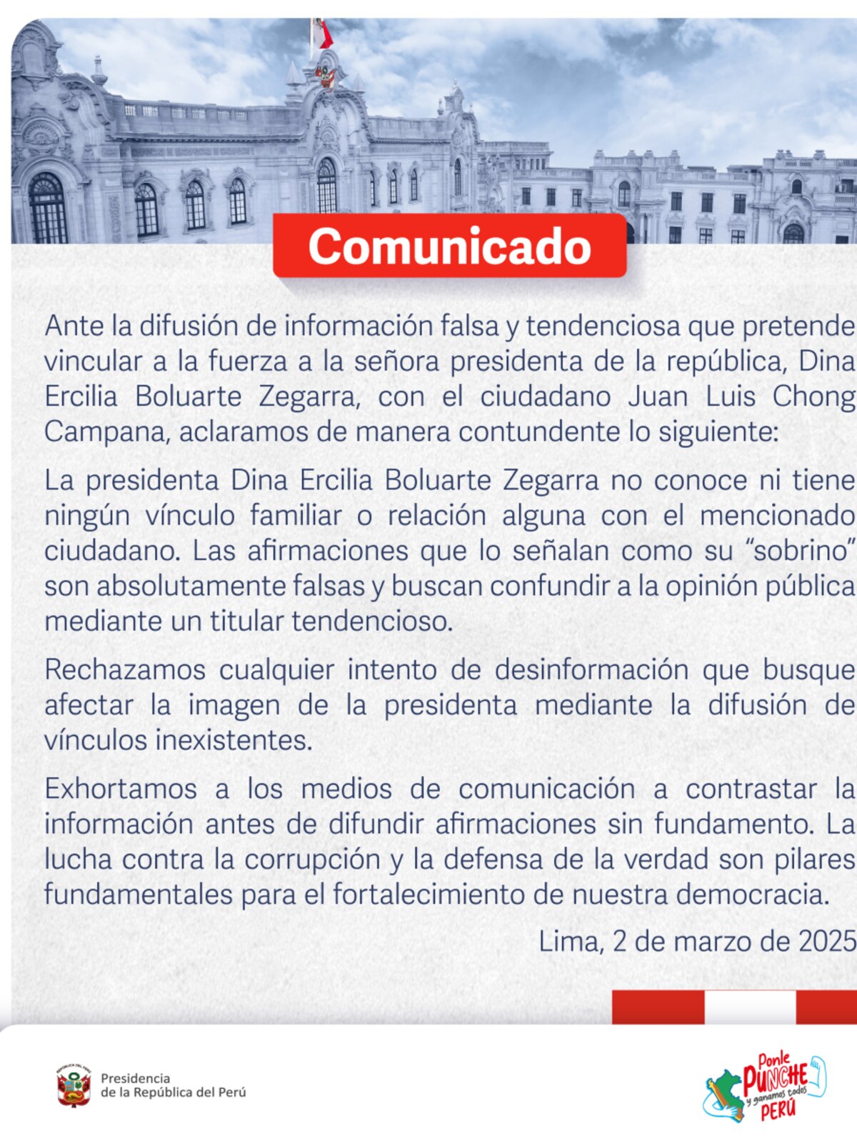 Chong Campana fue sentenciado en 2021 tras comprobarse que cobró coimas a empresarios a cambio de facilitarles contratos de obras públicas. En 2023, intentó modificar su pena por vigilancia electrónica utilizando el Decreto Legislativo 1585, promulgado por el gobierno de su tía, pero su solicitud fue rechazada por el Poder Judicial en marzo de 2024 y ratificada en octubre.