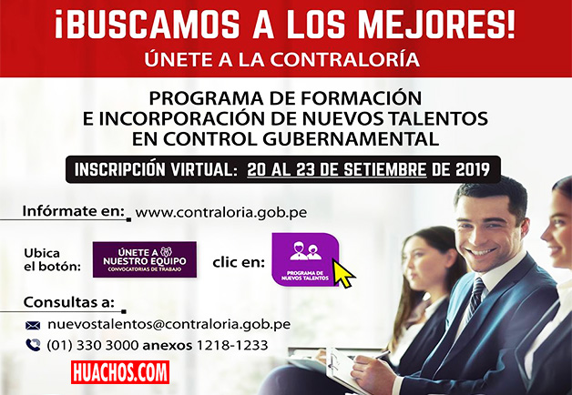 Por segundo año consecutivo, la Contraloría General de la República lleva a cabo el Programa de Formación e Incorporación de Nuevos Talentos en Control Gubernamental a nivel nacional. Su finalidad es reclutar a los mejores profesionales para que inicien una línea de carrera en la institución y contribuyan, con su aptitud y conocimientos, en la labor del Sistema Nacional de Control y a la mejora de la administración pública.