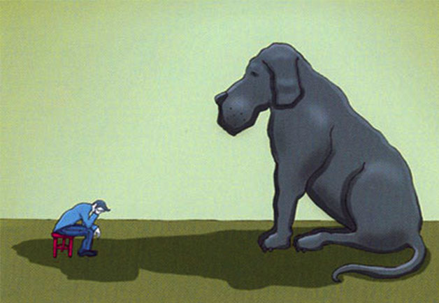 Un perro negro lo acompaña en todos lados, el can no le deja dormir ni comer bien; los ladridos de Black Dog resuenan lúgubres ; su nombre es “depresión“; la escena hace parte de un vídeo de la Organización Mundial de la Salud (OMS); la imagen la hizo célebre Winston Churchill. Sobre el tema, Matthew Johnstone escribió el libro ilustrado Black Dog of Depression.