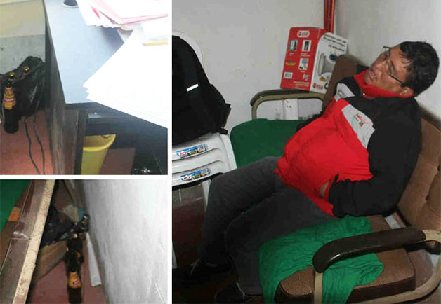 trabajadores utilizaron este espacio en horas laborales para hacer ingresar botellas de cerveza”, dijo el director mientras señalaba los lugares donde estaban los envases de cerveza, unos cerrados y otros abiertos.