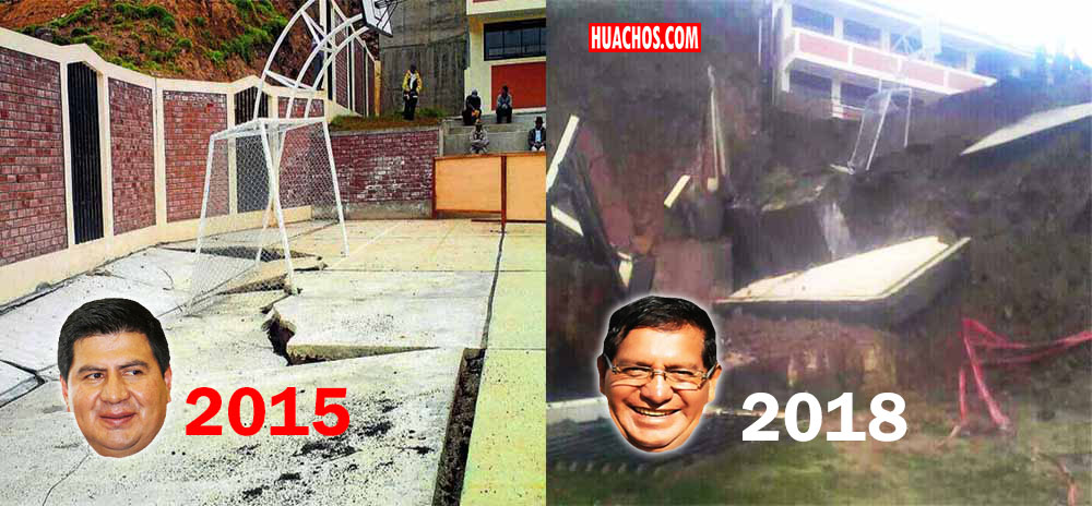 En Facebook circulan imágenes del estado actual de la institución educativa Santa Isabel. Se puede observar que la cancha deportiva -estaba ya rajado en mayo 2015- terminó de colapsar a vista y paciencia de las autoridades del colegio y del alcalde de la localidad.