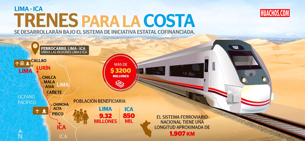 El denominado Tren de Cercanías, que unirá Lima e Ica, beneficiará a 969 mil habitantes de Lima, Barranco, Cañete, Chinca e Ica. La obra tiene una inversión de más de US$3 mil millones.