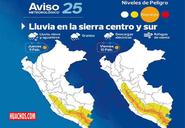 Lluvias de moderada a fuerte intensidad, además de nieve, granizo y aguanieve, se presentarán desde mañana jueves 9 al viernes 10 de febrero en 108 provincias de 14 regiones del país, informó el Servicio Nacional de Meteorología e Hidrología (Senamhi).