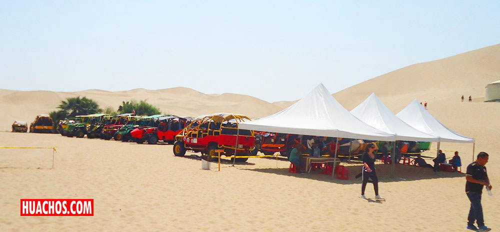 Los propietarios de autos buggies, en coordinación con el Gobierno regional y la Cámara de Comercio y Turismo de Ica, han improvisado un dunapuerto en la zona oeste de Huacachina, de donde salen y llegan vehículos transportando turistas que hacen un recorrido por las extensas dunas.