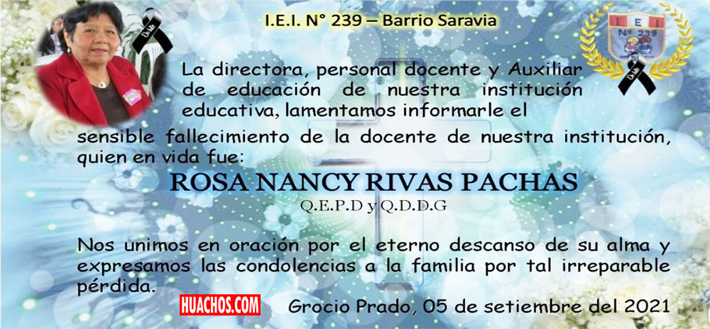 La maestra Nancy Rivas, estudió en el Instituto Superior Pedagógico de Chincha, graduándose como profesora de Educación Inicial. Su centro de labores fue el distrito de Grocio Pardo. Rivas Pachas demostró ser una mujer leal y servicial con sus amigos. Se caracterizó por su humildad y fortaleza moral. Deja 4 hijos: 3 mujeres y un varón. Conocemos sus sacrificios y desvelos para sacar adelante a sus vástagos, y cuidar su salud de ellos en los momentos difíciles. En su escuela se destacó en varios aspectos, mereciendo el aprecio de sus niños y colegas. La docencia para ella fue un apostolado, donde cumplía con eficiencia sus labores. Impuso, orden y limpieza en su aula.