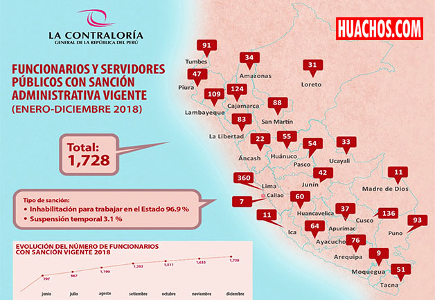 LIMA | La Contraloría General informó que 1,728 funcionarios y servidores públicos fueron suspendidos o inhabilitados temporalmente para ejercer la función pública, al haber sido sancionados administrativamente por inconducta funcional (sanciones vigentes al 31 de diciembre del 2018).