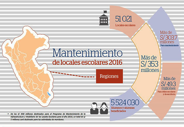 De los S/ 353 millones, S/ 303.7 millones serán para el mantenimiento de la infraestructura y S/ 49.3 millones se dará a los locales de nivel primaria, secundaria o integrado para la compra de útiles escolares y de escritorio, materiales para uso pedagógico y equipamiento menor.