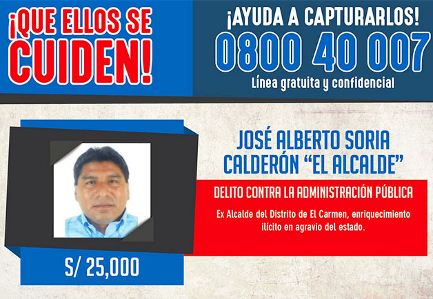 exalcalde del distrito de El Carmen (Chincha), José Alberto Soria Calderón (44) alias “El alcalde”, requerido por el delito contra la administración pública en la modalidad de enriquecimiento ilícito.
