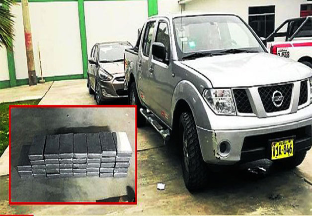 Agentes del Departamento Antidrogas de Ica detuvieron a tres personas que se desplazaban en dos vehículos con un cargamento de más de 40 kilos de clorhidrato de cocaína. La mercadería ilegal estaba en 38 paquetes rectangulares embalados y se ocultó debajo de los asientos en la carrocería de la camioneta Nissan de placa V1A-846.