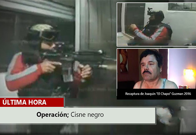 La Marina de México ha hecho públicas las imágenes del operativo de captura de Joaquín El Chapo Guzmán. El vídeo fue grabado con una cámara instalada en el casco de uno de los soldados que llevaron a cabo la acción. El vídeo, de 15 minutos, muestra la entrada del comando militar a la vivienda donde se escondía el narco con sus guardaespaldas en la ciudad de Los Mochis, Sinaloa. Guzmán logró escabullirse por un túnel conectado al drenaje público y fue capturado posteriormente en otro punto de Los Mochis cuando intentaba huir en coche con su jefe de seguridad Iván Gastélum. Las imágenes del asalto a la casa son un continuo intercambio de fuego de alto calibre entre los marinos y los sicarios del cártel.