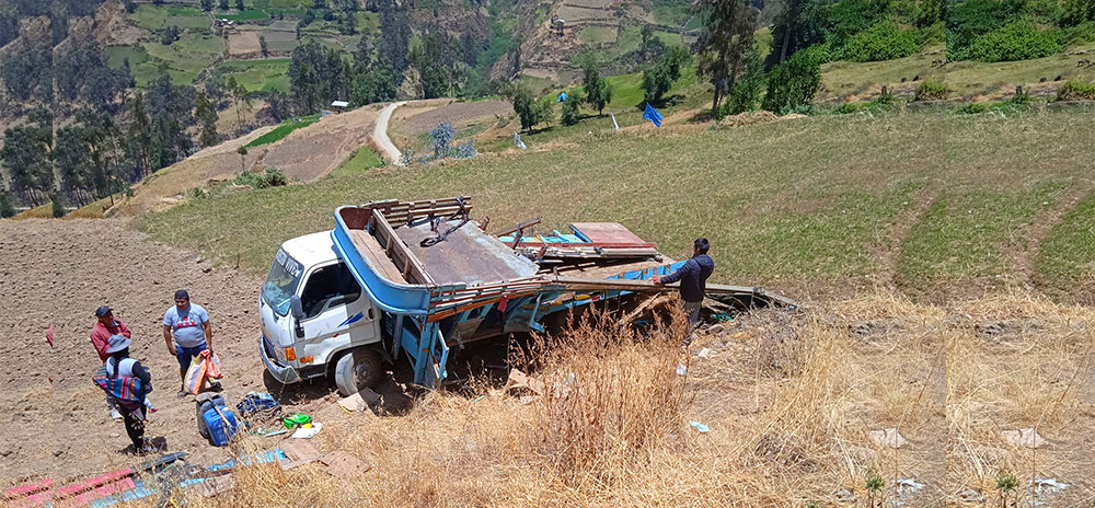Para dar pase a un minivan y el camión mixto que venia de Cajamarca transportaba algunos pasajeros, ganado vacuno y ovino, retrocedió y cayó al vació dando una vuelta de campana, el conductor de la unidad se encuentra bien.