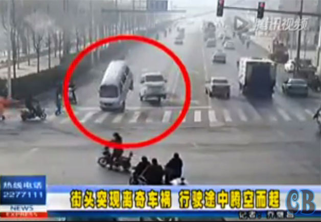 En la ciudad de Shenzen (China) una cámara de video vigilancia filmó en una intersección un accidente aparentemente sobrenatural. Tres vehículos se levantan en al aire como por arte de magia parecería que los vehículos se pelean en medio de la calle como si fueran dos caballos "chucaros".