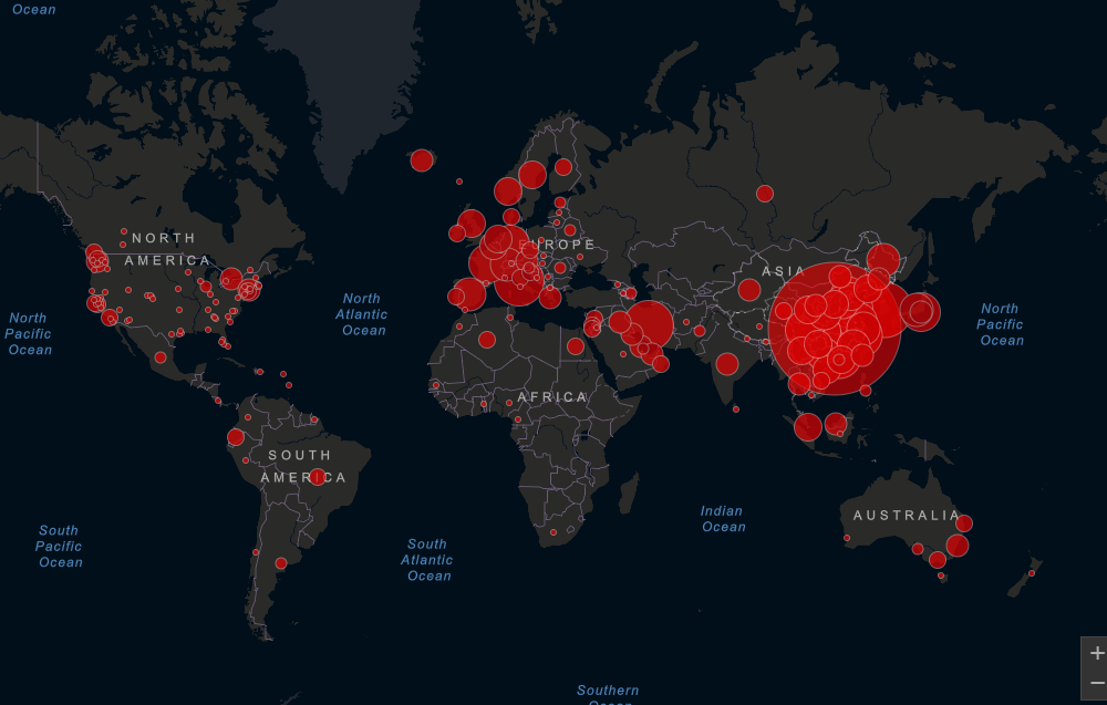 El mapa interactivo señala las regiones donde los pacientes han sido diagnosticados con coronavirus: cuantos más casos haya en una región, más grande será su punto en el mapa (en este momento, el punto más grande pertenece a la provincia de Hubei, donde se originó el brote).