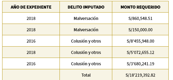 En suma, la procuraduría ha planteado una pretensión de S/18’219.392,82 por concepto de reparación civil en estos cinco expedientes por corrupción; un monto que ha sido solicitado de forma solidaria entre Cerrón y sus otros coacusados.